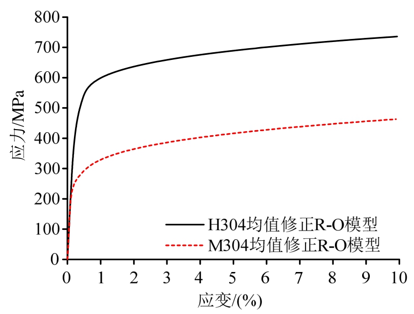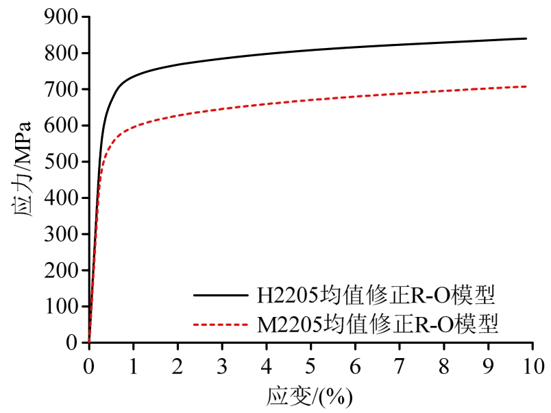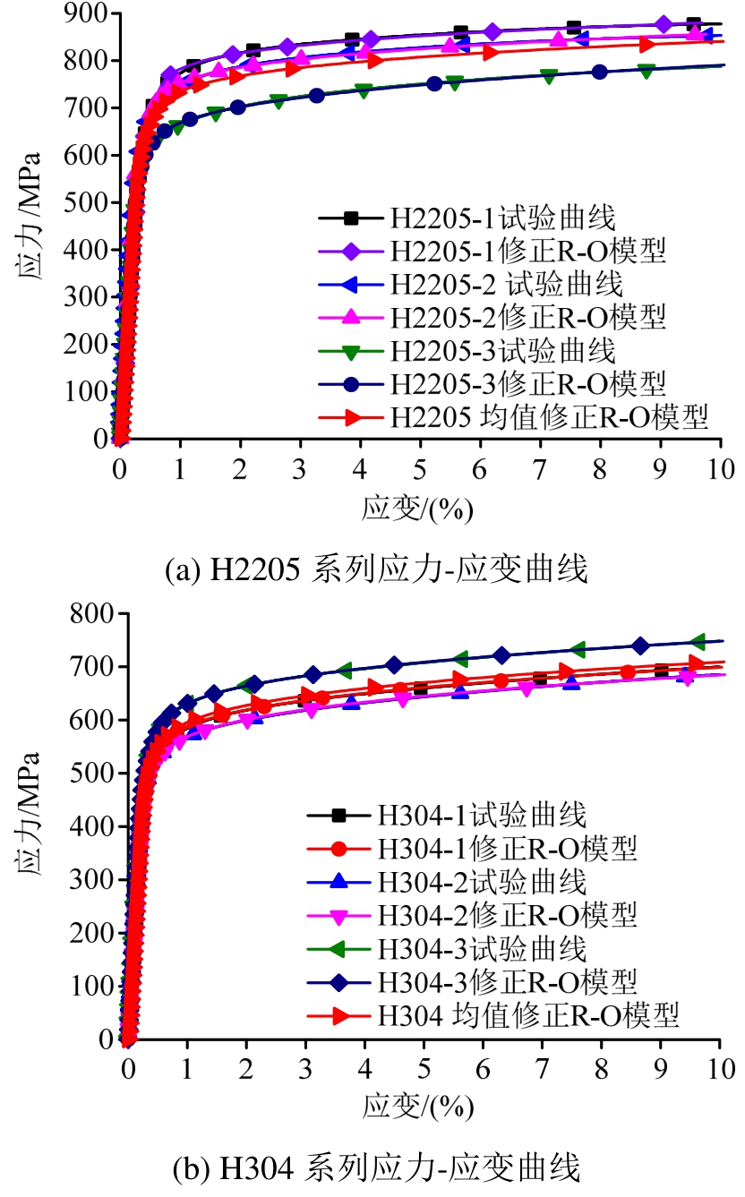 图7(a)和图7(b)分别为H2205系列和H304系列各试样修正R-O模型与利用表2中所示该系列各试样参数平均值绘制的修正R-O模型(以下简称均值修正R-O模型)对比。图8为双相型不锈钢母材与其焊缝金属材料均值修正R-O模型的对比。图9为奥氏体型不锈钢母材与其焊缝金属材料均值修正R-O模型的对比。