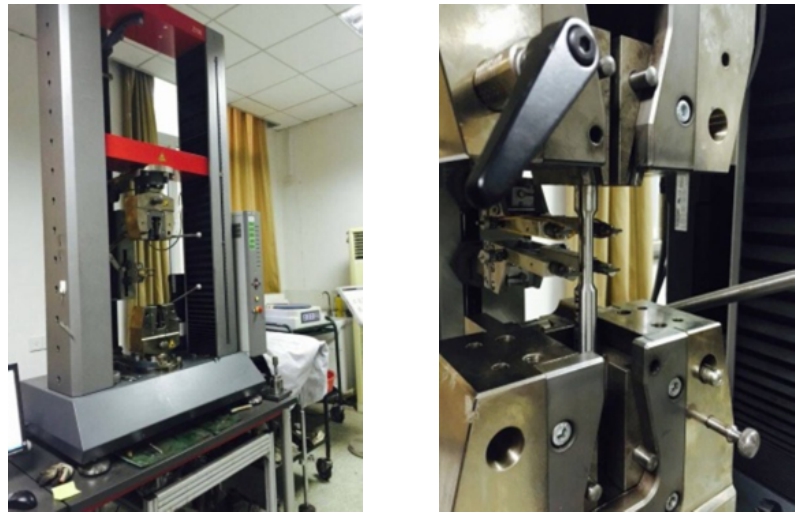 采用Zwick/Roell Z100型拉伸试验机进行不锈钢母材和焊缝金属材料试样拉伸试验,并按照《金属材料拉伸试验第一部分:室温试验方法》(GB/T 228.1—2010)[18]的要求进行加载,在弹性阶段和屈服阶段均采用位移速率2 mm/min,屈服之后,按照位移速率10mm/min进行。该试验机器最大吨位为10t,自动引伸计标距为25 mm,精度等级为1级。试验加载装置如图3所示。