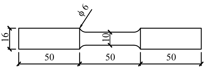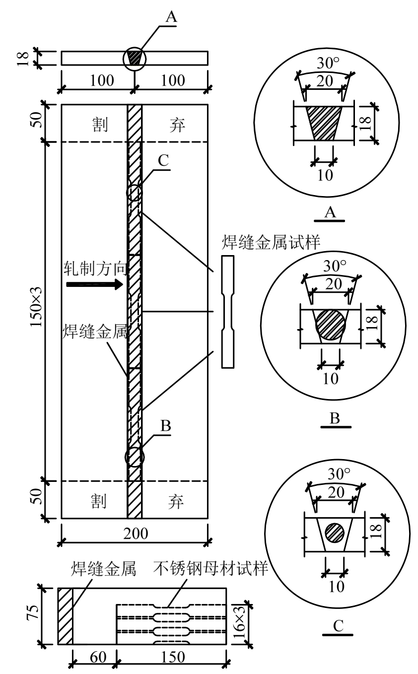 本试验按照母材与焊缝金属材料等强匹配的原则,使用E2209焊条对16 mm厚双相型S22053不锈钢板件进行对接焊接,并使用E308焊条对18 mm厚奥氏体型S30408不锈钢板件进行对接焊接,焊缝形式为全熔透坡口焊,焊接工艺采用手工电弧焊,焊接完成后取不锈钢母材和焊缝金属棒材试样进行室温拉伸试验,为避免焊缝附近热影响区对母材试件力学性能的影响,故母材试件在距焊缝60mm处的板件边缘截取,试样取材部位及焊缝尺寸示意图如图1所示。不锈钢母材及焊缝金属的化学成分如表1所示。