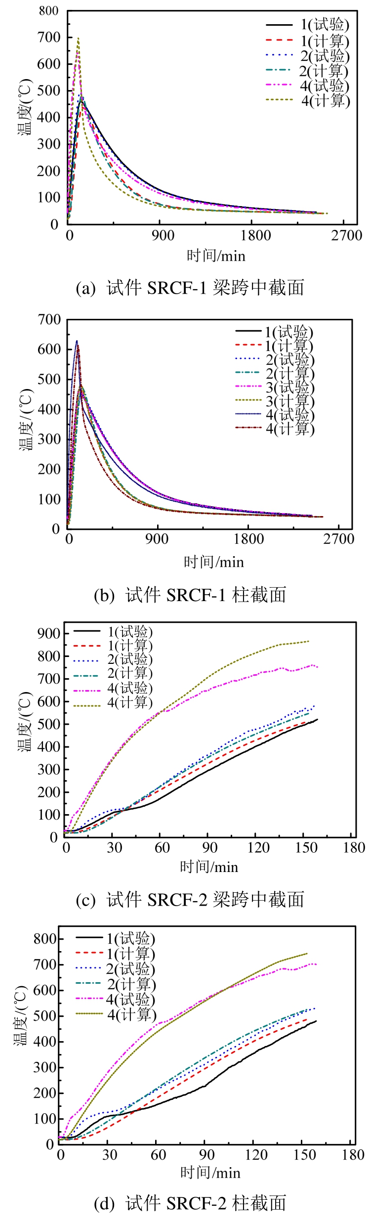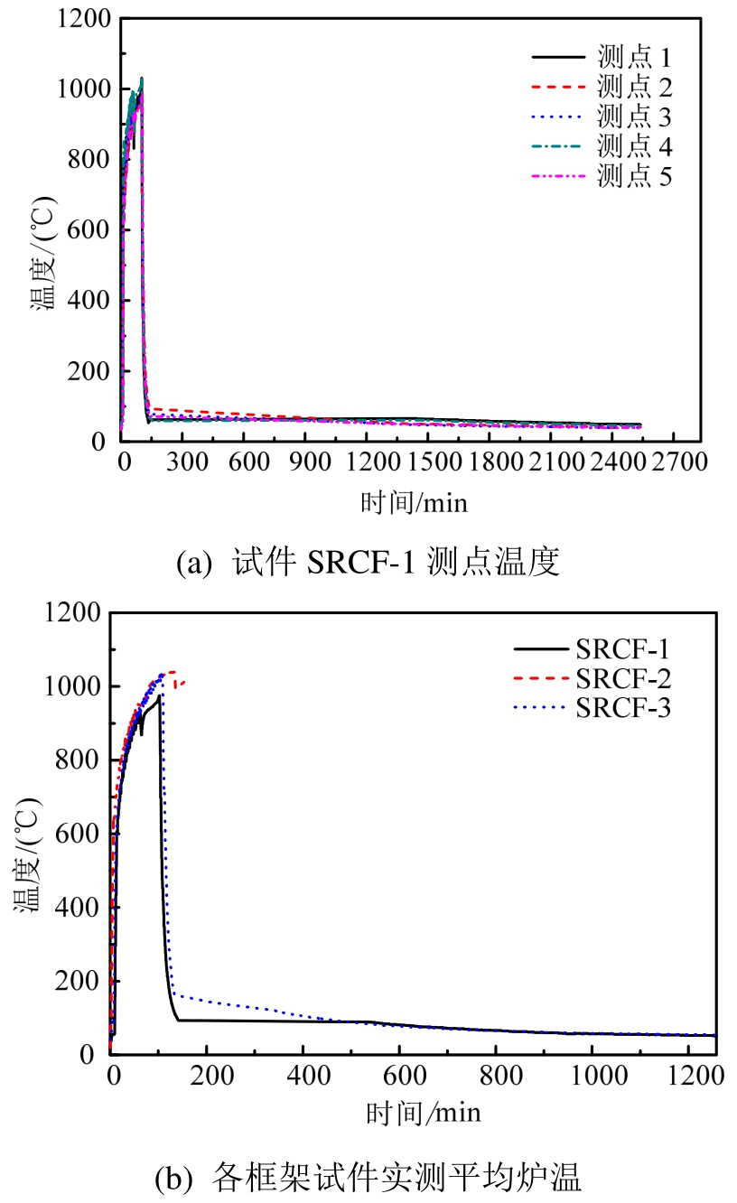 图6(a)给出了试件SRCF-1火灾炉5个内部热电偶测量的炉温与时间的关系,从图中可以看出炉温温度均匀,差别较小。图6(b)给出了3个试件平均炉温与时间的关系。分析图7中SRCF-1和SRCF-2梁、柱截面温度-时间曲线可知,试件内部截面温度远低于炉温,测点距离试件表面越远,温度滞后现象越明显。试件梁、柱截面测点1的温度低于外部测点4的温度,说明试件温度越往里越低,且升温时间越长差值越大。