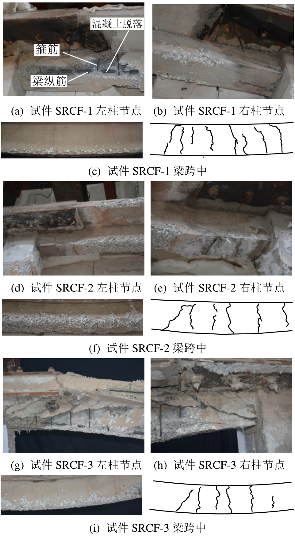试件SRCF-3为火灾后破坏,整体破坏形态见图4(c),柱子角部和梁底发生明显剥落,其剥落程度较试件SRCF-1更为严重。由图5(g)、图5(h)可知,在平面框架左柱节点附近混凝土剪压区出现大量的混凝土脱落现象,在框架右柱节点附近出现了多条弯剪斜裂缝,从梁端及梁底部斜向上发展至加载段,在距离梁端350mm处梁底部出现局部混凝土脱落,范围大约为300mm。梁跨中纯弯段区域出现受拉垂直裂缝,裂缝平均间距为100mm,方向与梁轴线方向垂直,裂缝分布如图5(i)所示。