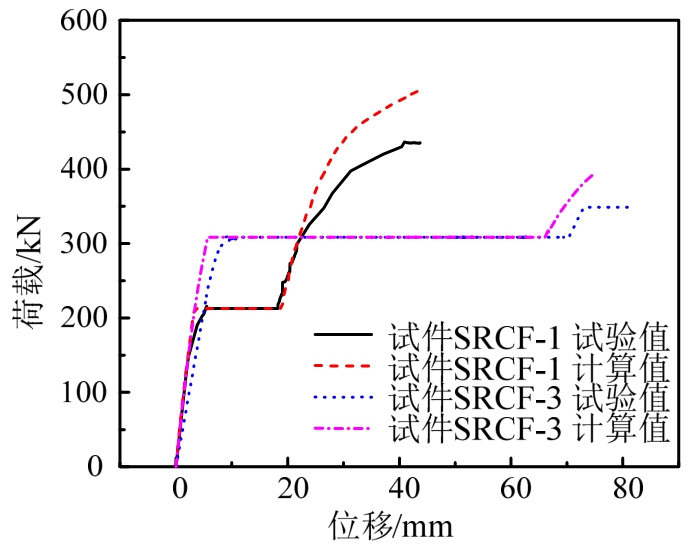 试件SRCF-1和试件SRCF-3的荷载-位移曲线如图9所示。从图中可以看出,当完成常温阶段加载后,框架梁基本处于弹性阶段;而在升降温阶段,试件SRCF-1挠度的变化值为13 mm,试件SRCF-3的变化值为61 mm。可见,试件SRCF-3在升降温阶段梁跨度中部的变形较大,这是由于试件SRCF-3的受火时间较长,在升温阶段材料性能的劣化更加严重,导致在降温段变形也较大。在火灾后加载阶段,从荷载-挠度曲线可以看出,在加载初期,梁仍处于弹性阶段,当荷载增大到307 kN时,荷载-挠度关系曲线开始出现非线性,当接近极限荷载时,非线性关系已非常明显。对于试件SRCF-3,降温结束时,梁的跨中挠度已经达到70mm,变形较大,荷载增大至348.8 kN,梁无法继续持荷,试件破坏。