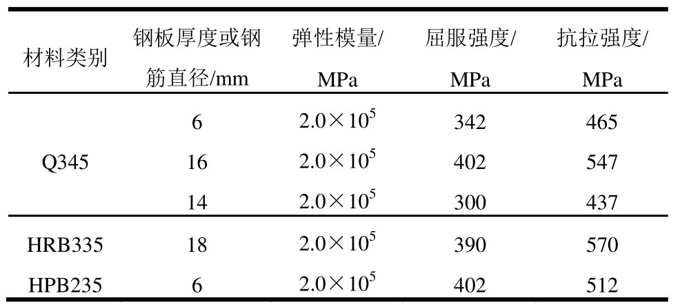 型钢混凝土平面框架中型钢采用Q345钢,梁柱纵筋采用HRB335级钢筋,直径18 mm,楼板内布置有单层双向分布钢筋,直径8 mm,采用HRB235级钢筋,梁柱内箍筋为HPB235级钢筋,直径6 mm,间距100mm。钢材和钢筋力学性能如表2所示。水泥采用普通硅酸盐水泥,强度等级为42.5 MPa,配合比为mw:mc:ms:mg=0.38∶1∶1.045∶2.121,试验时混凝土材料的立方体抗压强度为46 MPa。