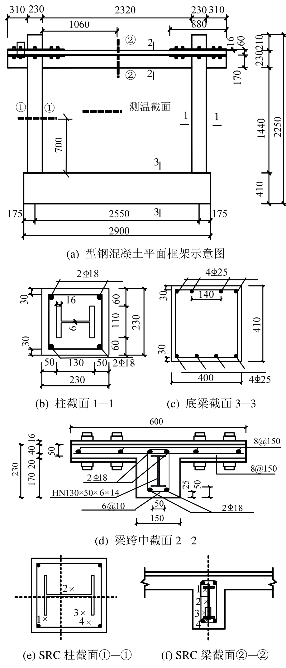 图1 型钢混凝土平面框架截面尺寸及热电偶布置图/mm