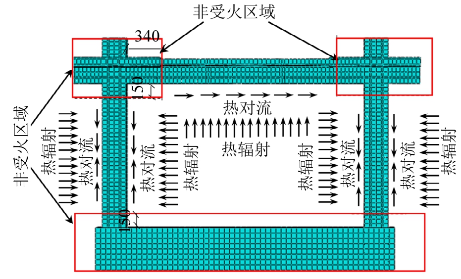 温度场计算采用ABAQUS有限元分析软件,型钢和混凝土采用三维实体热分析单元DC3D8划分网格。研究表明,钢筋对模型温度场的影响很小,模型中不考虑钢筋的影响。同时已有研究结果表明[16]:高温下,裂缝宽度大于3 mm时才会对截面温度场有一定影响,而在升温阶段,该文3榀框架出现裂缝宽度相对较小,进行温度场分析可以忽略裂缝对温度场分布的影响。对于边界条件,加固钢板节点区域以及地梁不设置热边界条件,型钢混凝土柱和梁表面按照第三类边界条件考虑热对流和热辐射,其中热对流系数取25 W/(m2·℃),综合热辐射系数取0.1。不考虑型钢和混凝土之间热阻对温度场的影响,受火区域如图10所示。