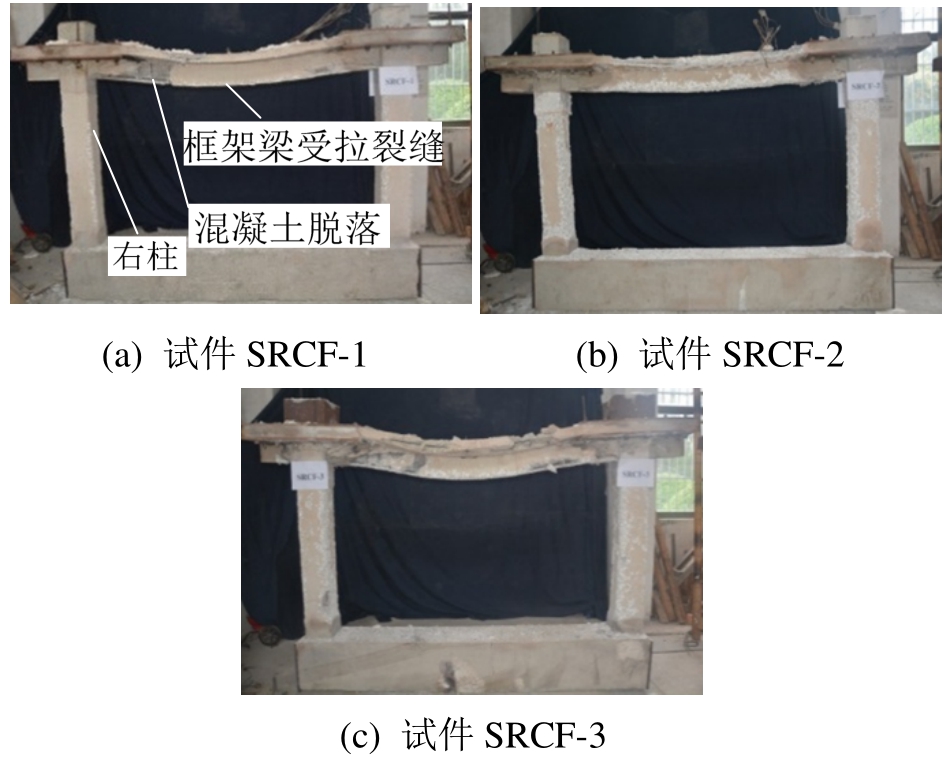 试件SRCF-1和试件SRCF-3的常温加载和升温阶段与试件SRCF-2相似。在降温段,随着梁截面温度的降低,型钢混凝土梁开始收缩变形,截面轴压力变小,梁跨中挠度继续缓慢增长,纯弯区段受拉裂缝进一步出现和发展,当截面温度降低到一定程度后,试件变形趋于稳定。在火灾后阶段,随着梁荷载的逐渐增大,梁端上部纵筋屈服,首先在梁端形成塑性铰。梁端受拉斜裂缝处的混凝土在正应力和剪应力的共同作用下弯剪斜裂缝宽度加大,弯剪区混凝土脱落。同时梁跨中弯矩逐渐增大,下部纵筋屈服,此时在梁端及跨中形成3个塑性铰,梁变成机构而无法继续受荷。