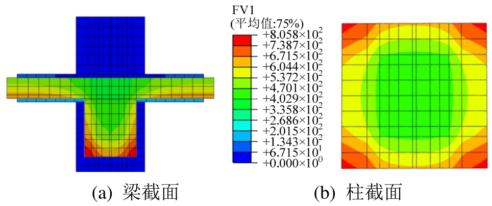 对于火灾后型钢混凝土平面框架的计算,涉及升温、降温及火灾后这三个阶段,且这三个阶段材料本构关系各不相同。升降温各区段的划分以及过火最高温度场的计算方法详见文献[3]。试件SRCF-1梁、柱截面过火最高温度场如图11所示,图中FV1表示过火最高温度。