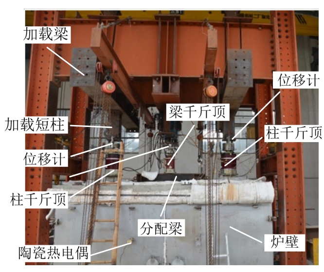 火灾试验炉炉膛的净尺寸为3.0m×2.0m×3.3 m,试验炉以天然气为燃料。反力架主要包括两根主梁及型钢短柱,梁上布置有分配梁及圆钢支座以保证梁变形后加载的准确性。柱顶采用2000kN液压千斤顶、梁跨中采用600kN液压千斤顶分别进行加载,如图2所示。