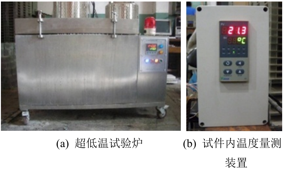 图2是本次试验的试验装置,包括用于混凝土经历降温回温作用的超低温试验炉、温控系统和测温装置等。其中,超低温试验炉的温度作用范围为300℃~-196℃,通过温控系统可设置各种降温回温作用速率,满足本次试验对试验装置的功能要求。试件内的温度变化则由埋置的低温热电偶通过测温装置直接获取。