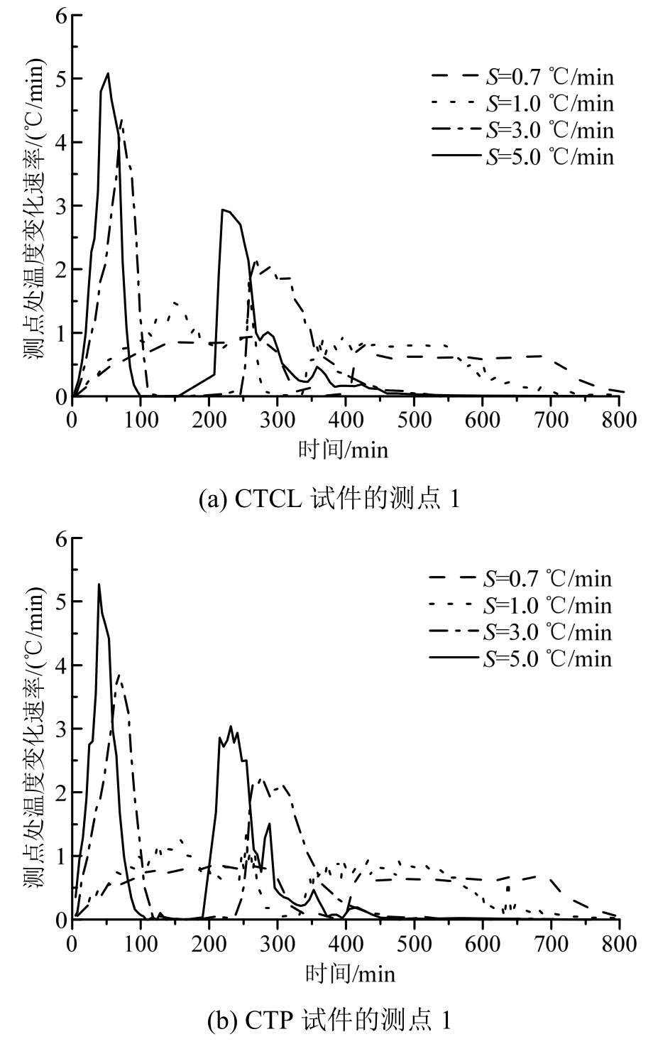 当S相同时,混凝土内不同位置处温度降至给定值所用时间的变化趋势相近,其值相差也较小。如S分别为0.7℃/min、1.0℃/min、3.0℃/min和5.0℃/min时,CTCL试件的测点1处温度达到-196℃滞后于测点3处分别达8 min、11 min、10min和9 min。由上面数据也可以看出不同的降温速率对滞后时间的影响相近。