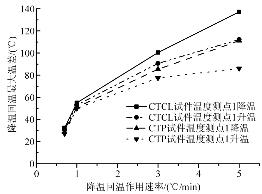 可看出,试件不同测点处与炉内环境的温差在降温与回温过程具有相似的变化趋势,但靠近试件表面的测点处降温与回温过程的温差峰值较为接近。例如,S=5.0℃/min时,CTCL试件测点3处在降温与回温过程的温差峰值分别为-87.3℃和86.1℃。远离试件表面附近的如中心位置的温度在降温与回温过程的温差变化差异则相对较大。例如,S=5.0℃/min时,CTP试件测点1处温度与炉内的温差峰值在降温与回温过程分别为-114.3℃和88.7℃。