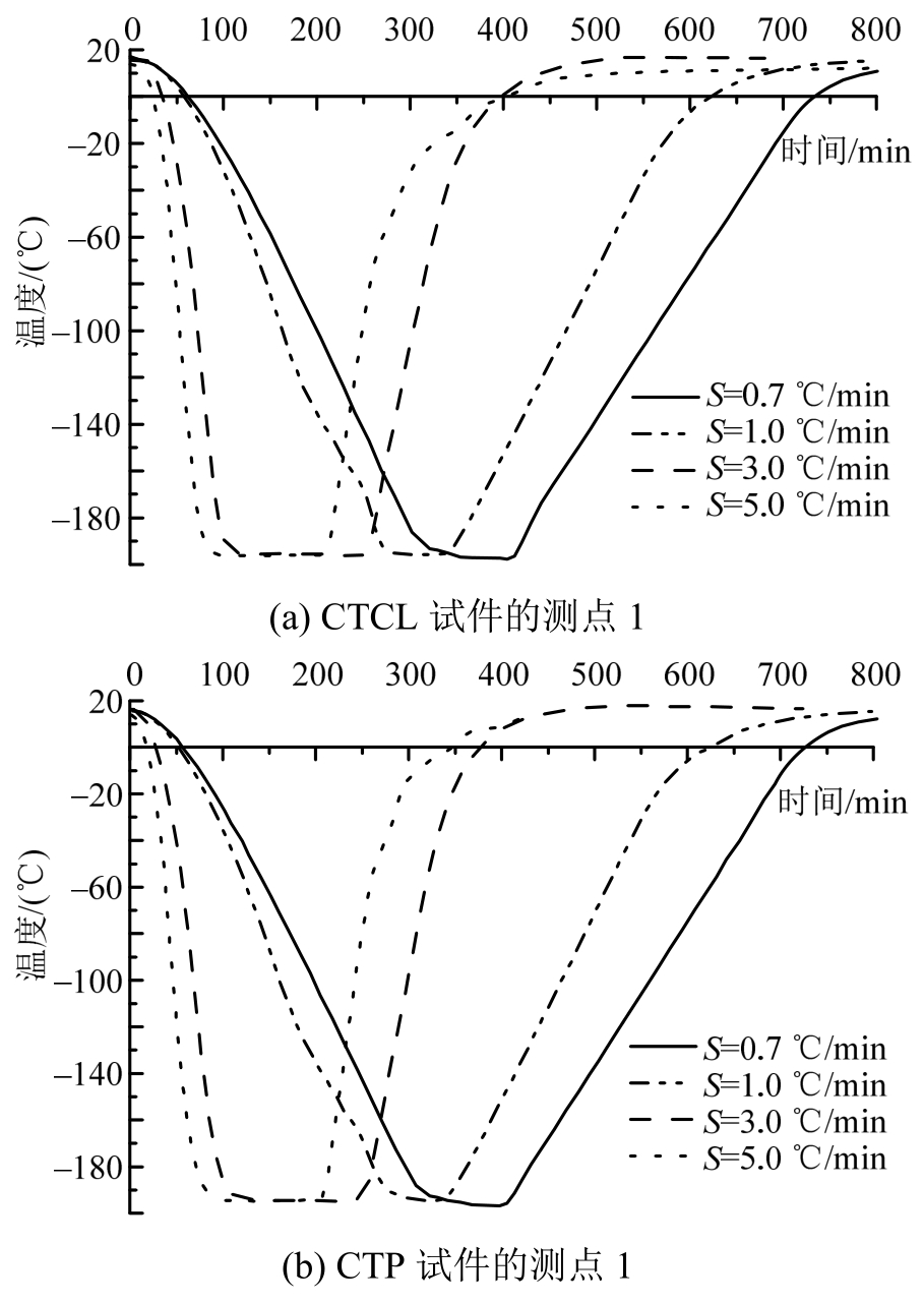 从图4中看出,随时间的增加,不同的试件形状和降温回温作用速率S下测点1处温度均有相似的变化规律。无论降温还是回温过程,CTCL和CTP试件测点1处温度在约20℃~-30℃区间内变化较为缓慢,并且明显低于S;在-60℃~-170℃区间内能保持较为稳定的速率进行降温或回温,此时的温度随时间变化近于一直线;在约-170℃~-196℃区间内变化又趋缓且降温或回温速率存在较轻微的波动。同时S低的测点1处温度变化要相应滞后。