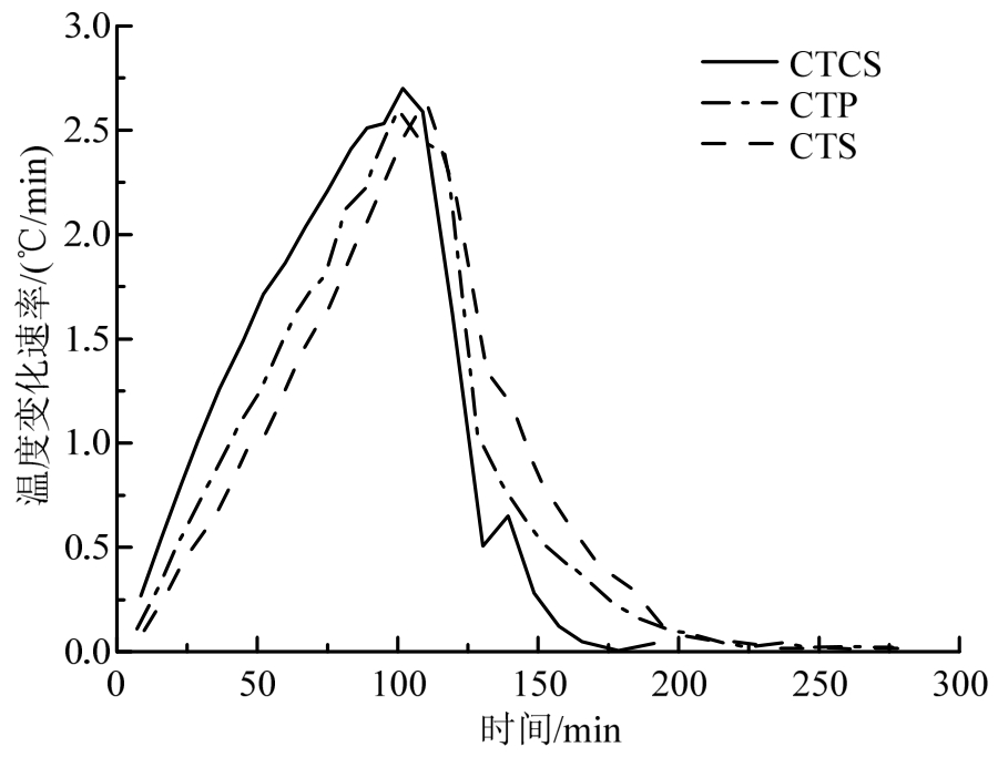 本次试验采用3种形状的试件,试验结果表明不同形状试件混凝土内温度变化差异也较为显著。图10给出了S=2.0℃/min时CTCS(小立方体)、CTP(棱柱体)和CTS(平板)3种试件中心处降温过程的温度变化速率。