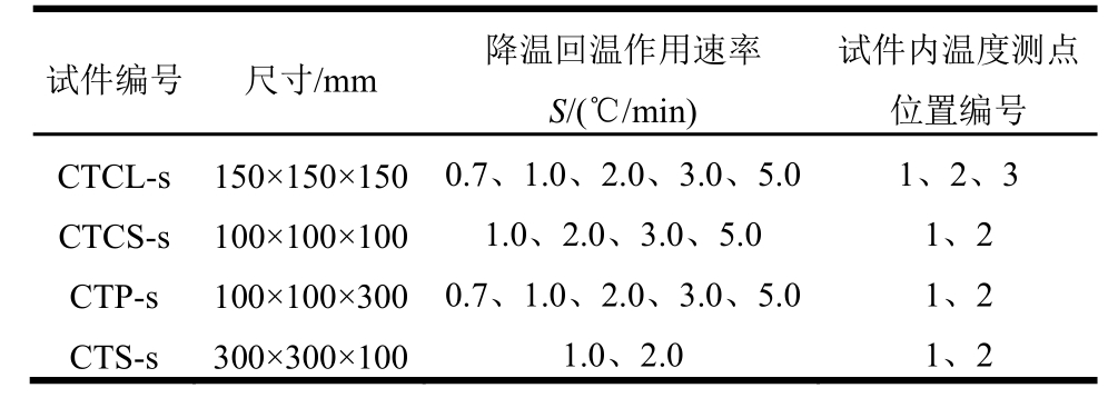 本次试验的温度变化范围为20℃~-196℃,通过降温、恒温和回温3个过程中混凝土内各测点处温度随时间的变化情况,考察试件的形状、尺寸以及降温回温作用速率等因素对混凝土超低温下温度分布的影响。试验的主要内容及其试件编号见表1。其中,CTCL、CTCS、CTP和CTS分别表示大立方体、小立方体、棱柱体和平板等形状或尺寸不同的4种试件,S表示降温回温作用速率。
