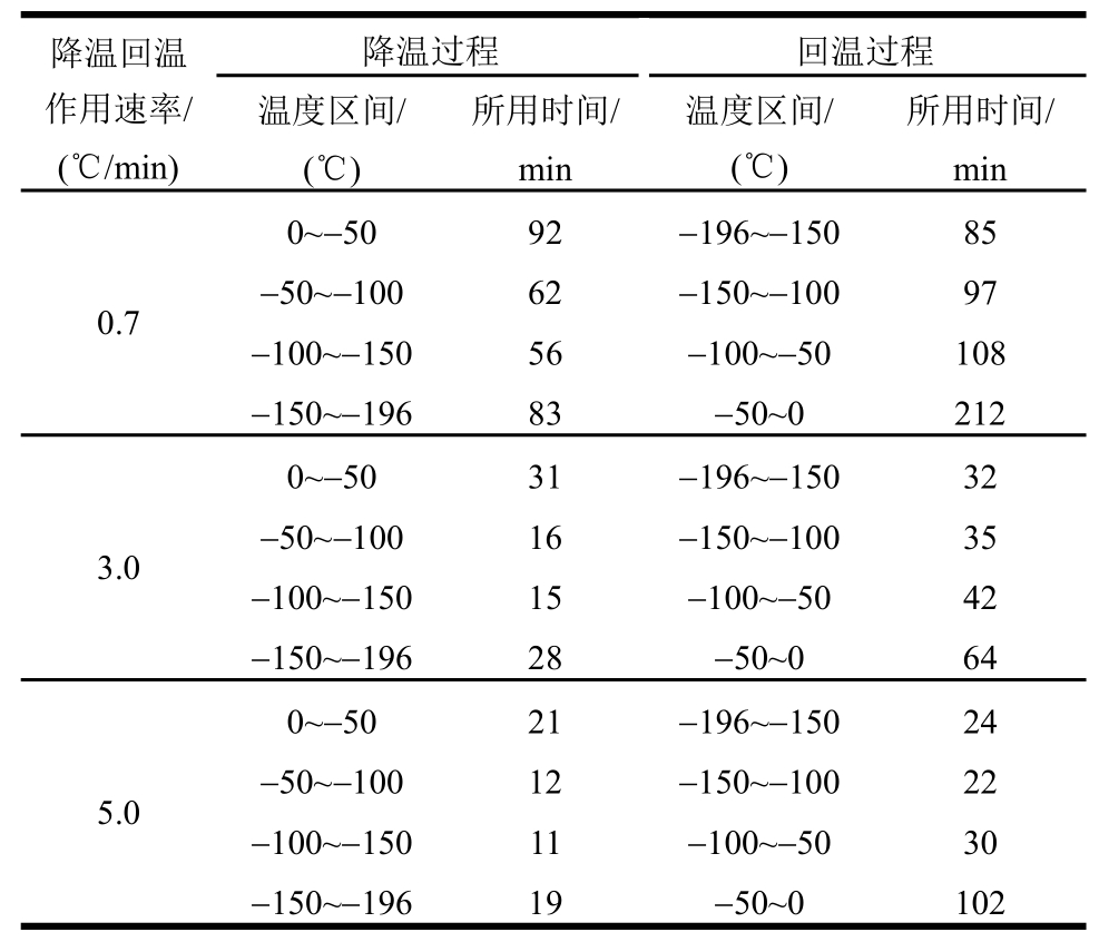 以CTCL试件的测点1为例,选取降温与回温时的0℃、-50℃、-100℃、-150℃及-196℃,测点1处温度达到这些给定值所用的时间如表3所示。可看到,测点1处回温过程各个给定温度所用的时间均超过降温过程。其中,-50℃~0℃温度区间回温过程所用的时间最长,均达降温过程两倍以上。
