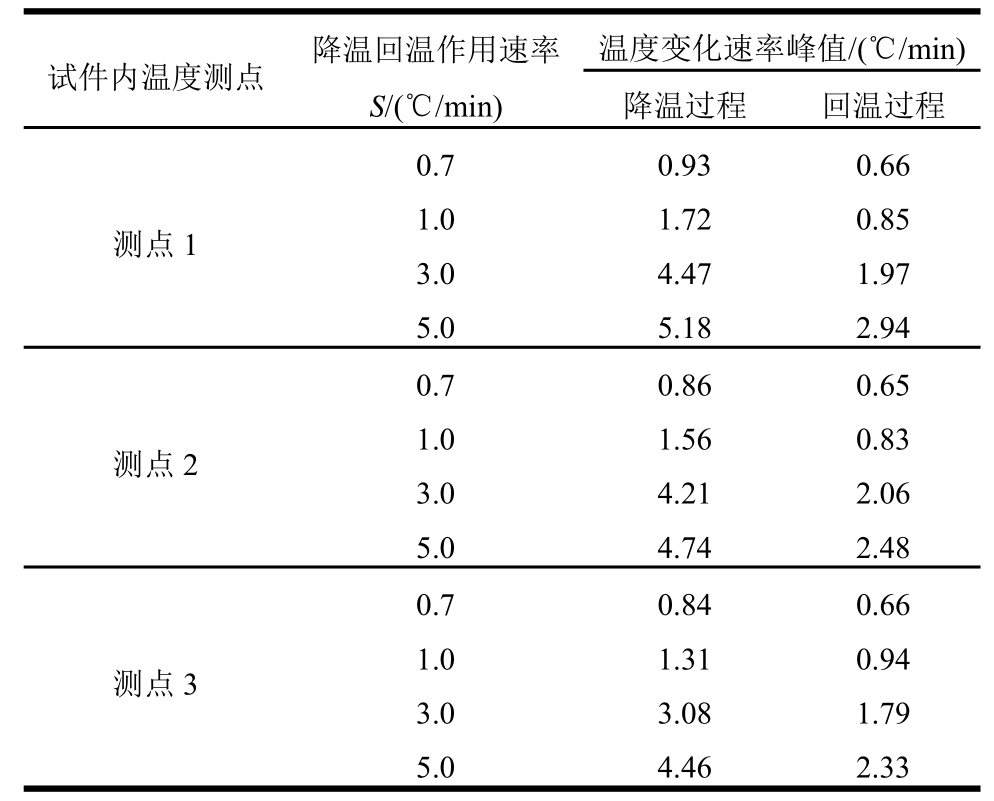 回温过程试件内所有测点处温度变化速率峰值始终低于S,明显小于降温过程的速率峰值,表明试件内温度回至炉内温度更加滞后,整个回温过程用时比降温过程更长。