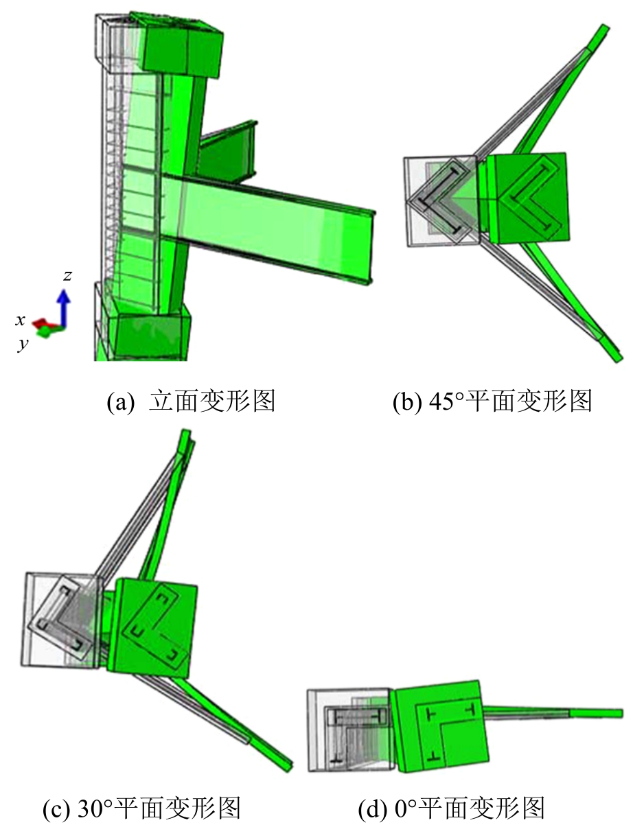 试件从初始阶段到破坏阶段的变形图放大8倍后如图7所示。图中浅色、深色部分分别表示试件的初始状态和破坏后的变形。由图7可见,试件不只在xz、yz面发生弯曲和剪切变形,在xy平面,节点核心存在张开和闭合弯矩,这种受力状态与顶层平面角节点在各加载角度下的受力状态相似。另外,可以看出30°和0°加载试件存在扭转变形,这是由于水平荷载通过截面形心,但不经过截面的弯曲中心所致,因此加载角度对试件变形影响显著。