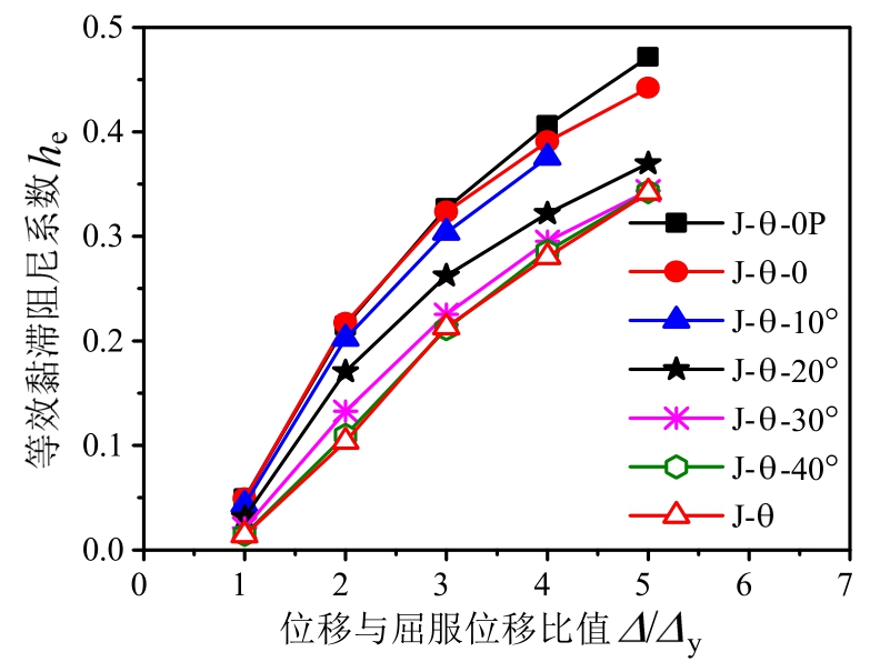 不同加载角度下试件的耗能和延性对比图见图23和图24。由图23可见,在各级位移下,随着加载角度的增加,试件的等效黏滞阻尼系数he值逐渐降低,这是由于加载角度越小,试件的扭转效应越明显,扭转虽使试件承载力降低,但同时吸收部分能量,因此试件的耗能能力越好。