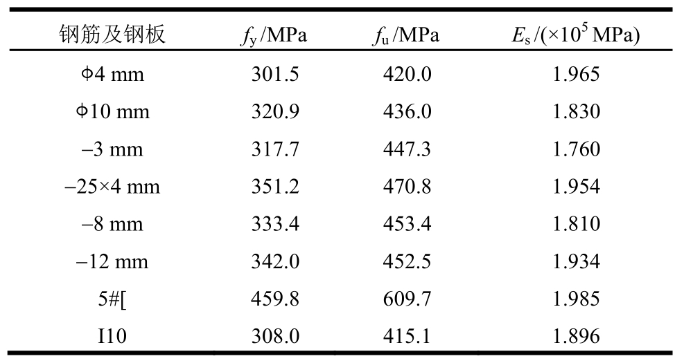 型钢-钢梁骨架采用相应规格的钢板焊接而成,T型钢桁架通过单侧焊接水平腹杆连接,槽钢桁架通过双侧焊接水平腹杆连接。对于实腹配钢与T型钢桁架的试件,柱中配有相应规格的构造纵筋和箍筋。构件采用C30混凝土立式浇筑,立方体抗压强度为30MPa。实测钢材与钢筋材料属性见表2。