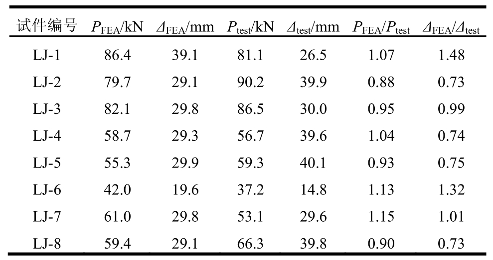 注:PFEA是峰值点对应的荷载计算值;ΔFEA是峰值点对应的位移计算值;Ptest是峰值点对应的荷载试验值;Δtest是峰值点对应的位移试验值。