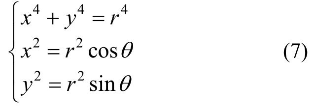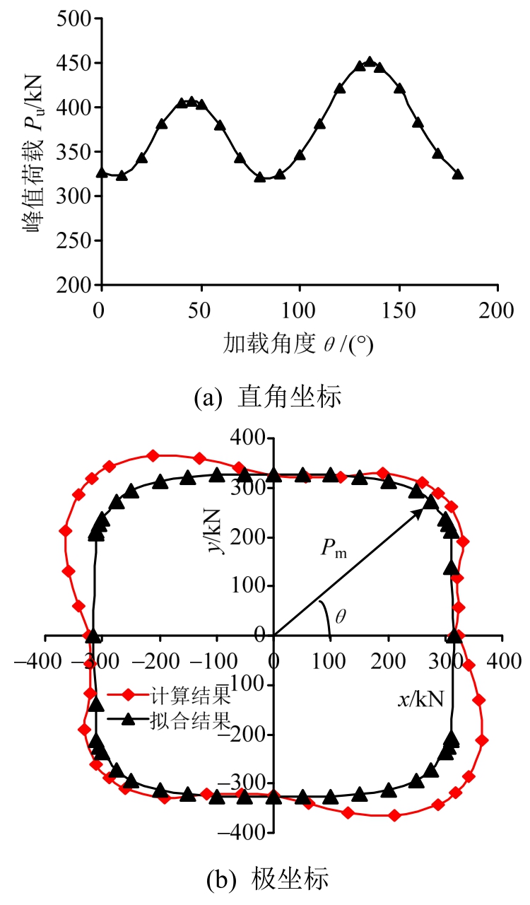 将峰值荷载与加载角度绘制在直角坐标系中如图22(a),与平面节点相比,45°加载试件的峰值荷载提高了约30%。第二象限的峰值荷载略高于第一象限,由于计算所得滞回曲线基本对称,可推算出1、3象限曲线相似,2、4象限曲线相似。补充3、4象限数据,将直角坐标系转化为极坐标系,如图22(b),该曲线经过拟合可得: