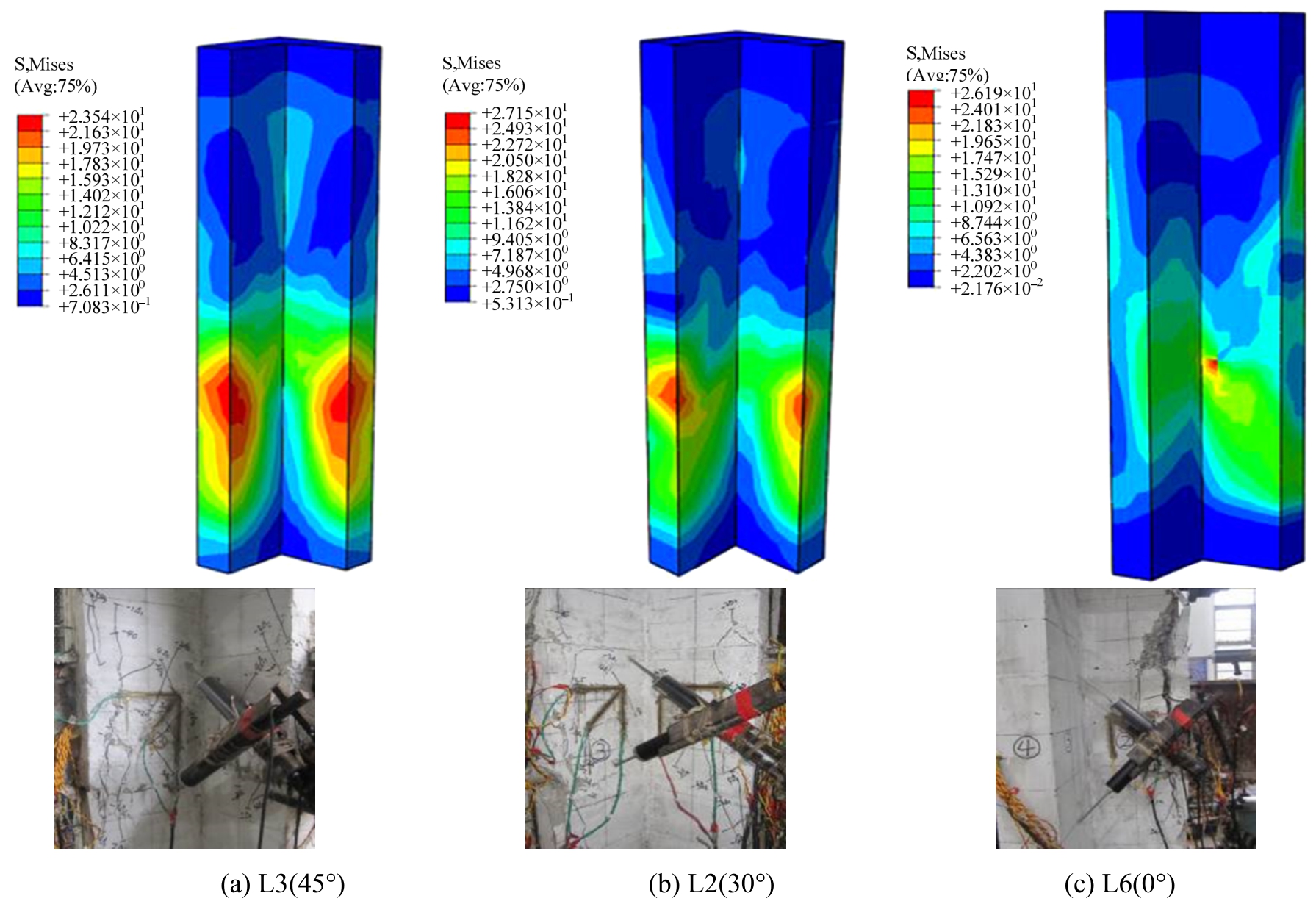 图5是加载角度分别为45°、30°和0°的试件L3、L2和L6破坏时混凝土应力云图与试验结果对比,可以看出,试件受负方向极限荷载时,沿试件高度500mm~550mm(钢梁与柱肢交汇处)和850mm~900mm范围(两肢交汇处,内核)附近,混凝土应力达到最大,并且破坏范围向核心区扩散,具有剪切斜压特点,试验试件核心区有斜向交叉裂缝和水平裂缝,沿柱型钢保护层厚度有粘结裂缝,30°和0°的试件还出现扭转变形。与内核相比,两柱肢的配钢量较小,并且钢梁的约束较大,故柱肢相对薄弱,破坏严重。