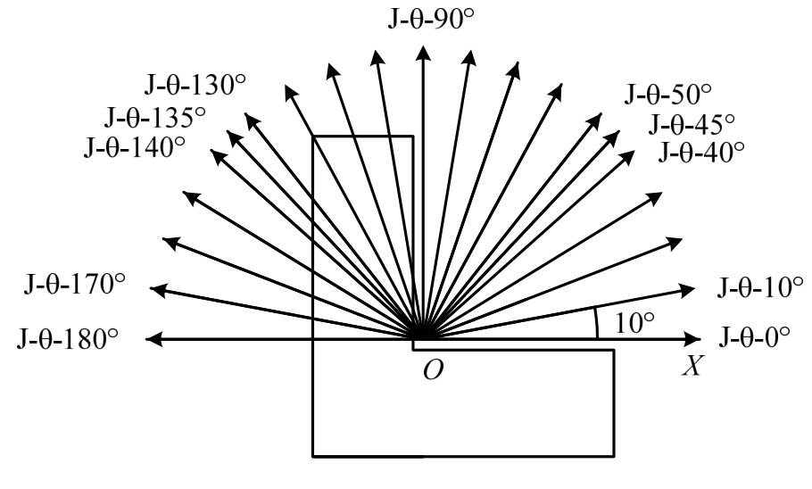 以J-S为研究对象,选取最有代表性的加载角(0°~180°,极差10°)进行分析,加载角度示意如图20所示,O为试件L形柱的截面形心。