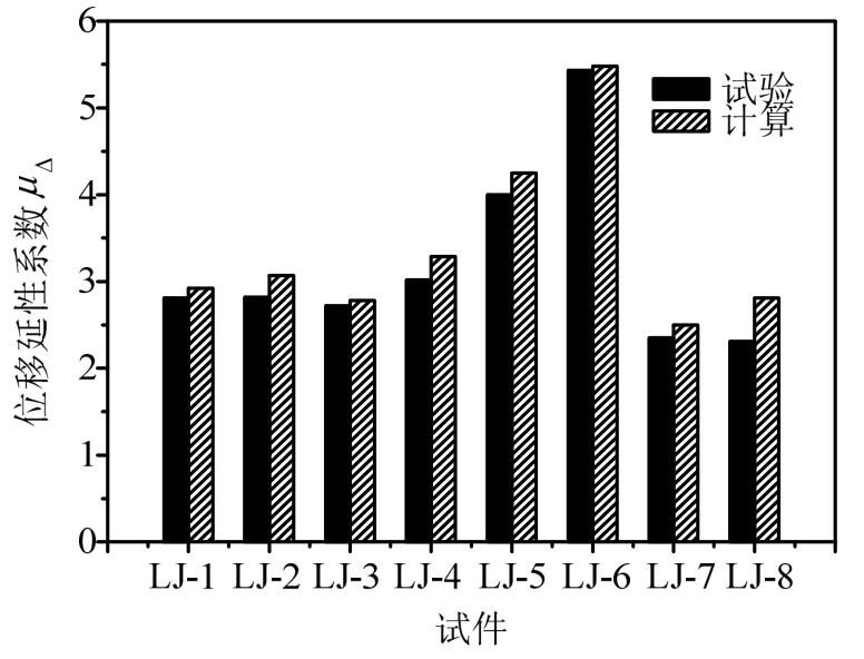 图10为延性系数的计算值与试验值的对比图。可以看出计算值较试验值略偏大,这也是因为滞回曲线的下降段计算值较试验值更加平缓,使其极限位移较试验值增加,从而导致位移延性系数较试验值更大,但误差基本在10%以内,可见该文基于试验建立的有限元模型计算其抗震性能是可行的。