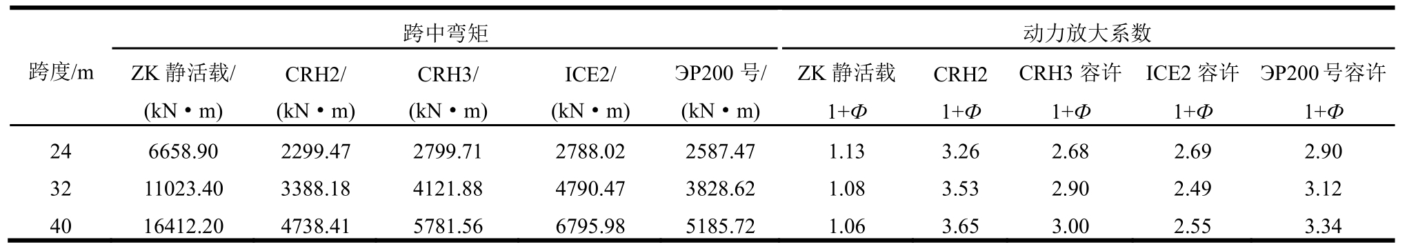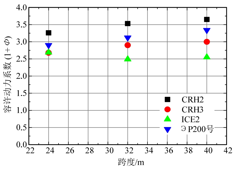 (1)根据运营荷载动力效应小于等于设计荷载效应,得到24 m、32 m和40m常用跨度简支箱梁在实际运营列车(CRH2、CRH3、ICE2和ЭР200号列车)作用下的容许动力系数。