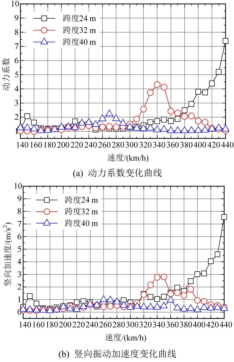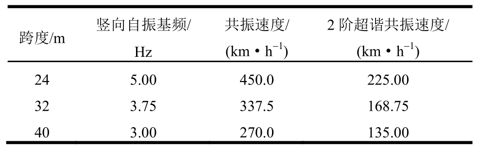 根据式(6)和式(7)可得:车长为25 m的CRH2型列车的激振频率fv=0.011v,图5中跨度24 m、32 m、40m简支箱梁竖向自振基频分别为5.00Hz、3.75 Hz和3.00Hz,理论共振速度如表3所示。根据图5仿真动力曲线:CRH2型列车作用下,使24 m、32 m和40m跨度简支箱梁动力响应达到最大值的运行速度分别为440km/h、340km/h和270km/h,此时列车激振频率与梁体竖向自振基频的比值分别为0.98、1.01和1.00,发生共振,数值模拟与理论分析一致;梁体在2阶超谐共振速度下的动力响应远小于共振速度下的动力响应。所以高速铁路设计中,主要通过控制简支箱梁的竖向自振频率避开列车的激振频率,控制梁体竖向共振现象的发生。