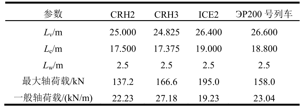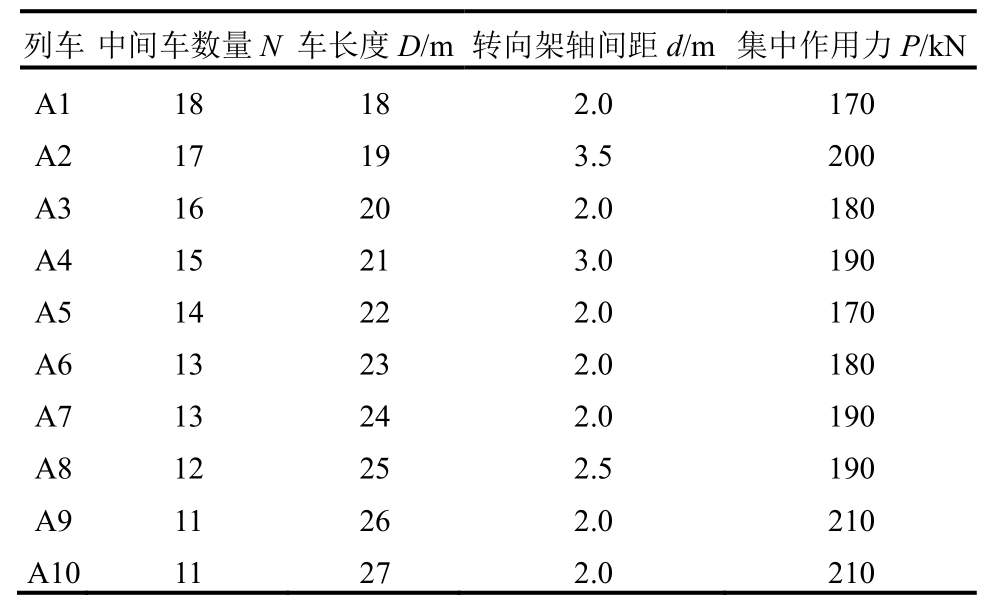 该文采用移动荷载分析模型,该模型不考虑车辆的振动效应,可以较好地反映出列车对桥梁的周期性激励规律[6,13]。选择不同竖向基频的桥梁模型,通过计算列车以不同速度通过时桥梁的动力响应,在综合分析桥梁动力响应与列车类型(轴重、轴距和车长),运营速度,桥梁刚度(竖向基频)关系的基础上,确定梁体竖向基频合理限值。
