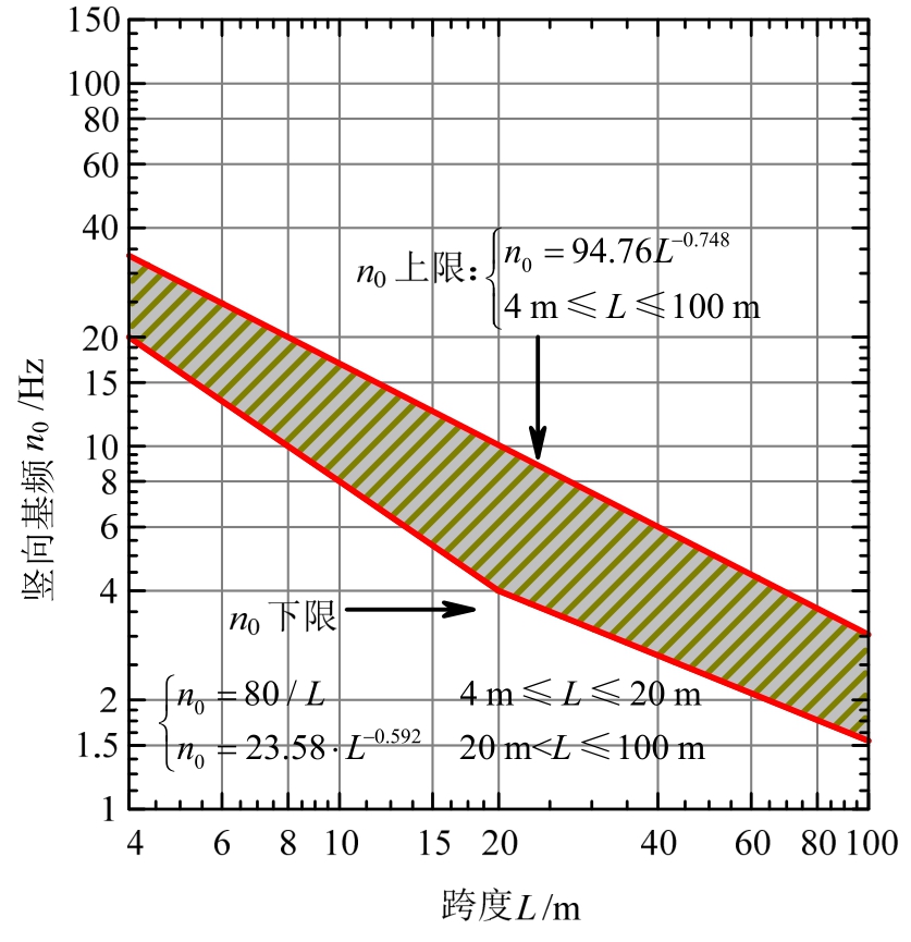 Fig.1 The UIC code of the vertical basic frequency limit of simply supported beam with different spans[1]