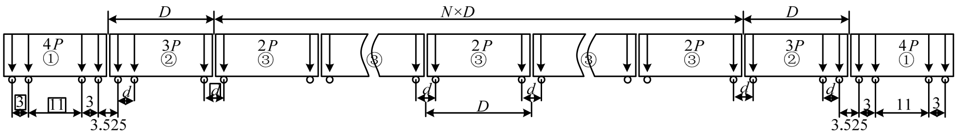 理论研究表明[7]:当列车以速度v通过桥梁时,由于其轴重荷载的规则性排列,会对桥梁产生周期性的动力作用。对于常用中小跨度简支梁,列车对桥梁的竖向激振频率主要取决于列车的速度v/(km·h-1)和列车长度dv/m,激振频率为: