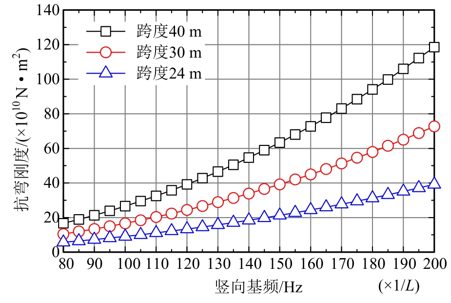 通过调节简支箱梁的截面高度,改变梁体竖向自振基频,图6为不同跨径工况下简支箱梁竖向基频与梁体刚度的关系曲线。由图可知:简支箱梁的刚度越大,其竖向基频越大;相同竖向基频条件下,简支箱梁跨度越大,其抗弯刚度亦越大。