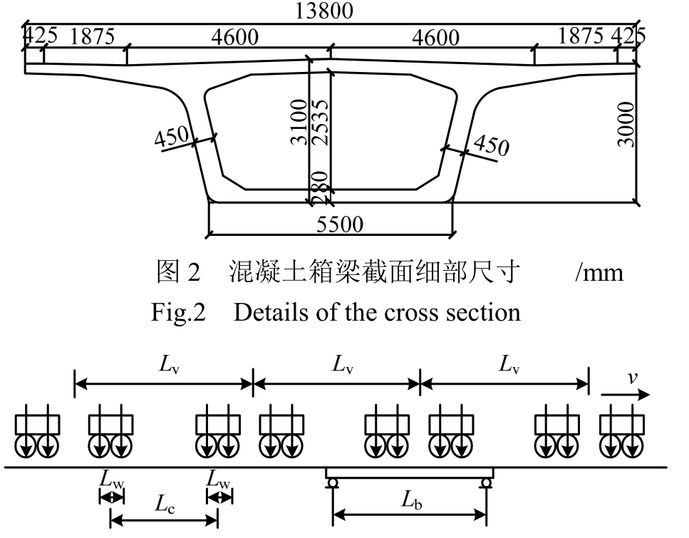 建立任意移动荷载作用下简支梁桥竖向振动数学模型,桥梁模型考虑欧拉-伯努利梁模型,列车荷载简化为一系列具有一定间距的移动常量力。假设简支梁为等截面(EI为常数),截面细部尺寸如图2所示,梁体质量均匀分布(单位长度梁的质量m为常数),阻尼为黏滞阻尼c(即阻尼力与结构的振动速度成正比),阻尼效应和质量及刚度性质成正比,荷载列以匀速v在梁上通过,梁的运动满足弹性范围内的小变形理论。受力模型如图3所示,移动荷载作用下简支梁桥竖向振动响应分析详见文献[14],限于篇幅,该文不再赘述。运营列车参数详见表1,其中Lv表示车辆全长(钩到钩间的距离),Lc表示车辆定距,Lw表示转向架固定轴距。