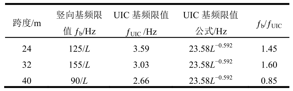 (4)基于移动荷载数值模型,通过理论与仿真分析提出预应力混凝土简支箱梁的竖向自振基频限值。车长25 m左右的运营列车作用下,建议设计时速400km/h,跨度24 m、32 m和40m的预应力混凝土简支箱梁竖向自振基频限值取125/L、155/L和90/L。