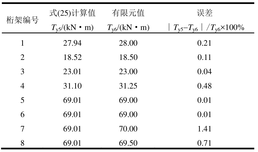 为进一步验证桁架屈服扭矩计算式(25)的正确性,同样取表3和表4中的8种桁架进行验证,对比结果见表6。