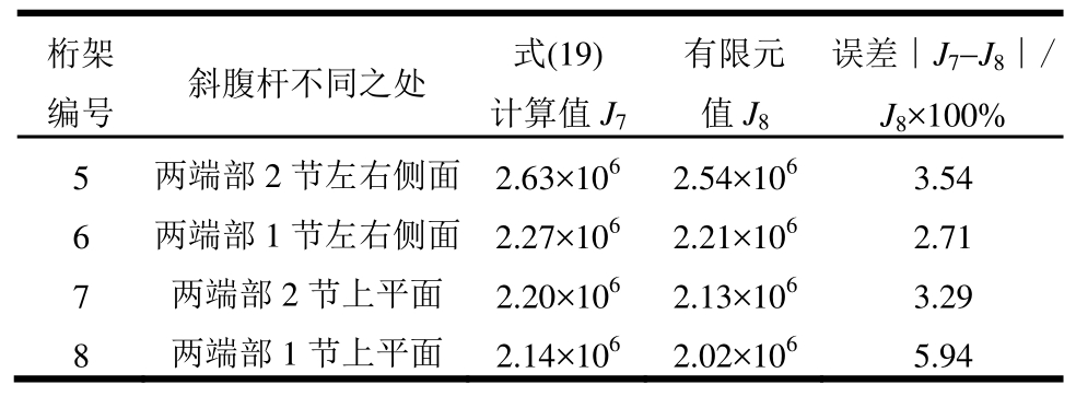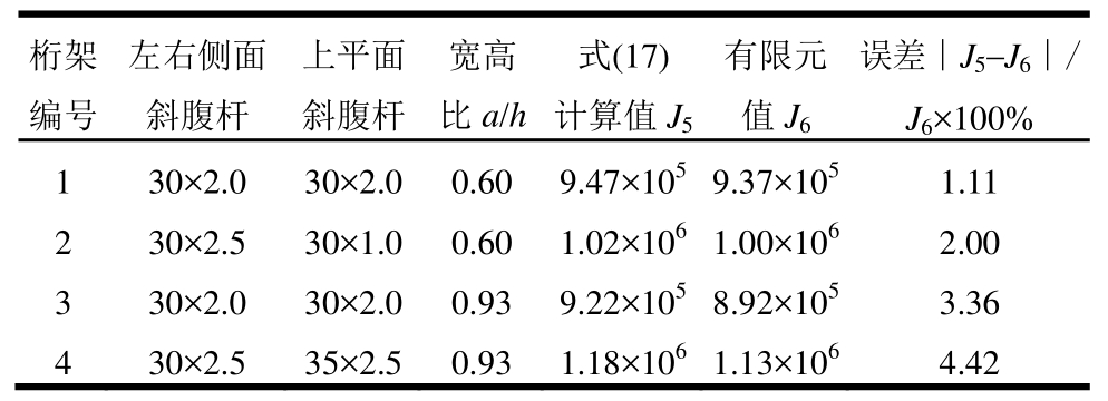 为验证变截面桁架抗扭刚度计算式(19),取4种桁架利用有限元进行验证,这4种桁架仅部分斜腹杆截面面积增大一倍,其余参数同试验构件,具体变化的斜腹杆和对比结果见表4。结果表明:式(19)计算结果和有限元值符合性较好。