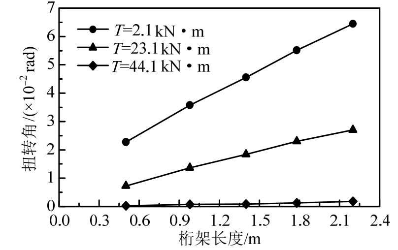 图8 扭转角沿桁架纵向变化