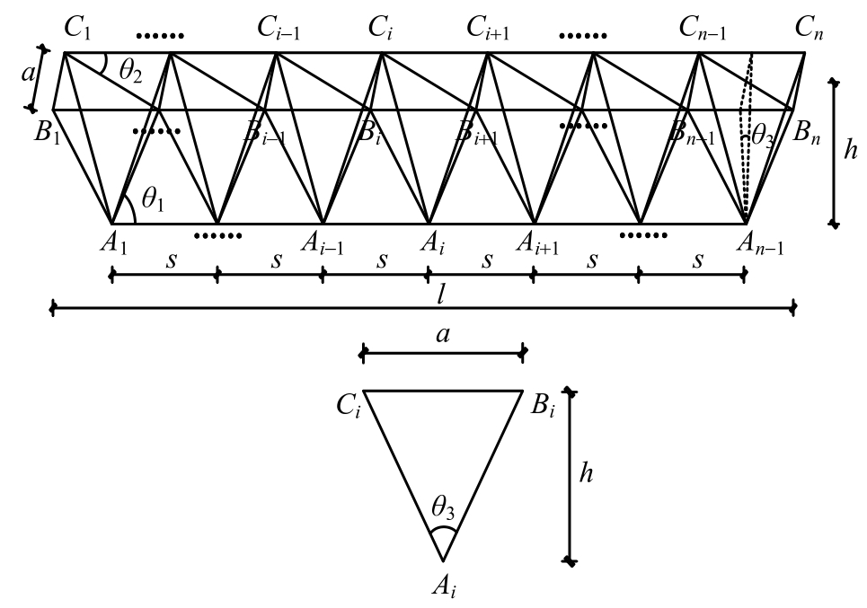 本文以横截面为等腰三角形的倒立四棱锥空间桁架为研究对象,见图1,但不限于此类桁架,对于具有类似特征的桁架也适用。桁架几何尺寸为:节间长度相等均为s,宽度为a,高度为h;左、右侧面斜腹杆长度、截面均相同,截面面积为Af1,与下弦夹角均为θ1;上平面斜腹杆截面面积为Af2,与上弦夹角为θ2;左右侧面夹角为θ3;下弦、上弦和横杆截面面积分别为Ax、As和Ah;各个杆件的弹性模量均为E。