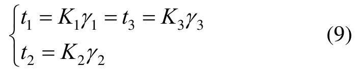 桁架三个侧面腹杆条轴力t1、t2、t3与桁架三个侧面腹杆条所对应的剪切变形γ1、γ2、γ3之间的关系可表示为: