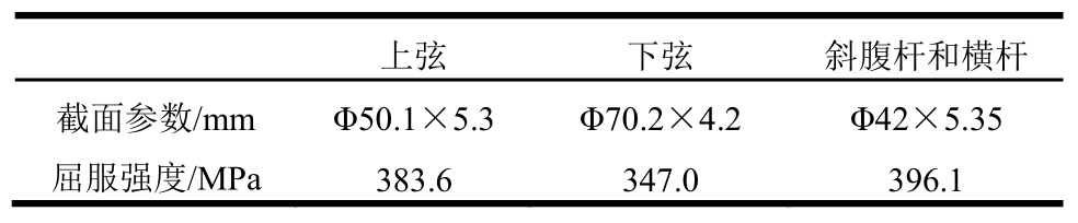 为对桁架抗扭性能理论分析的验证,设计了一个桁架进行试验。具体参数为:桁架杆件为圆钢管,材料为Q345B。构件总长度为2600mm,有效长度为2400mm,n=7;上弦截面为Φ50mm×5 mm,下弦截面为Φ70mm×4 mm,斜腹杆和横杆截面均为Φ42 mm×5 mm;s=a=h=400mm。杆件实测材料参数见表1。
