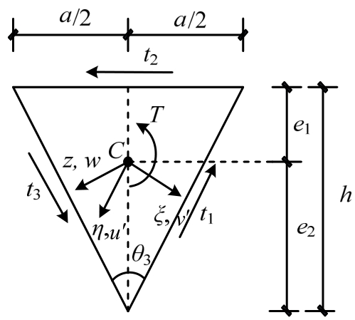 将桁架截面等价为三角形闭口截面,每个桁架面的腹杆等价为相应面的连续分布腹杆条,只有轴力(对于扭转来说就是桁架截面上的扭转剪力)[27];由假定3)可知,桁架在两端截面扭矩T作用下计算简图见图3。以扭转中心点C为零点建立直角坐标系x-y-z。图中x轴与桁架上平面平行,y轴与桁架上平面垂直,z轴为桁架纵向,对应于坐标轴x轴、y轴、z轴的位移分别表示为u、v、w。