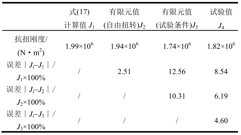 以上对比结果表明:试验实测值和有限元值-试验条件间误差较小;式(17)计算值和有限元值-自由扭转间误差较小;两种有限元模型模拟结果相比,同试验条件时的抗扭刚度小于自由扭转时的抗扭刚度;试验实测值小于式(17)计算值,详见表2。对比可见,试验值略低,而式(17)计算的结果略大,但相差均不大。