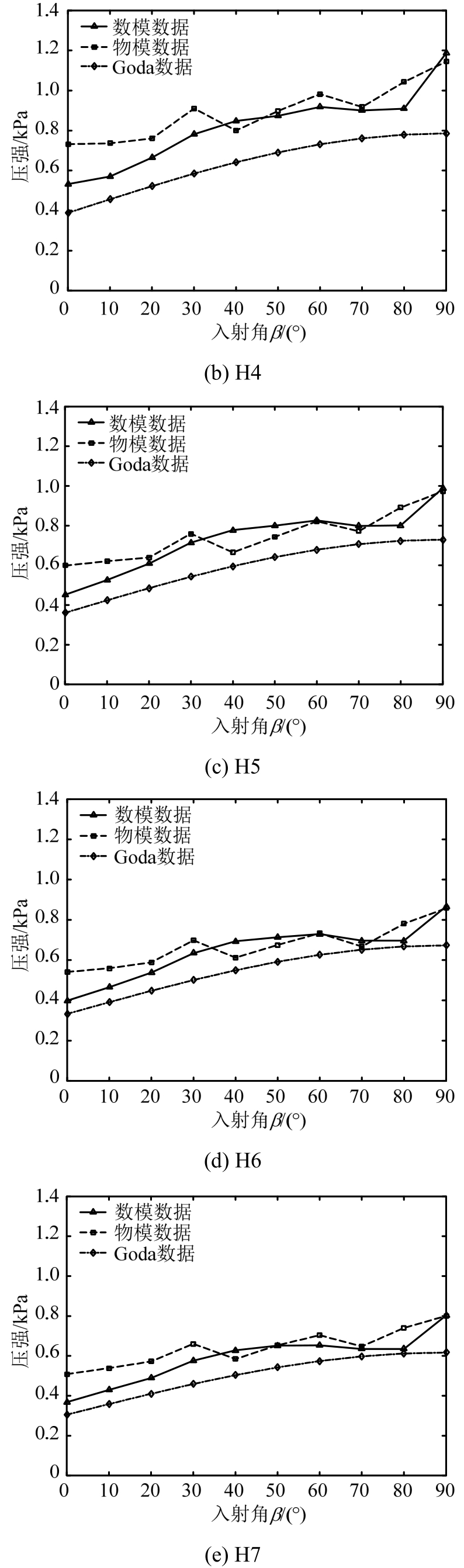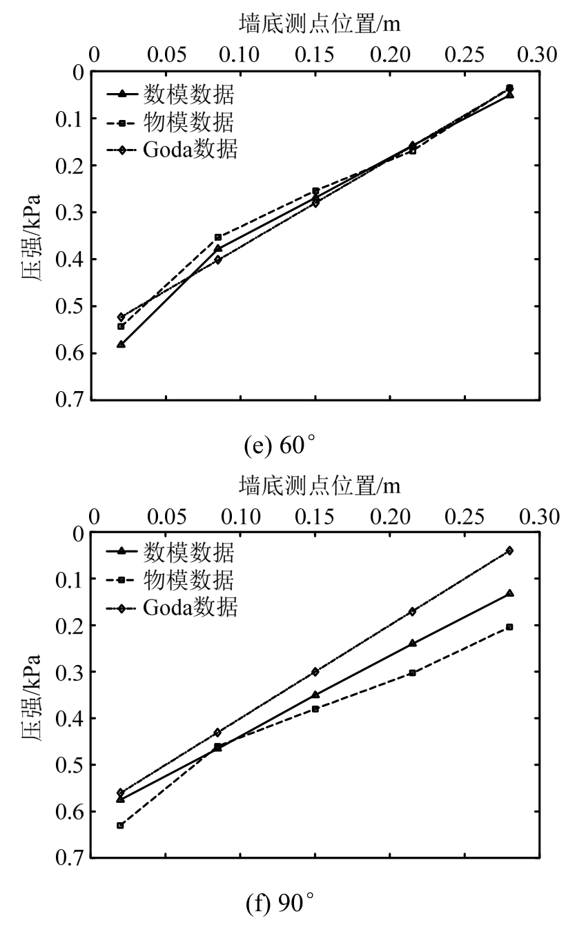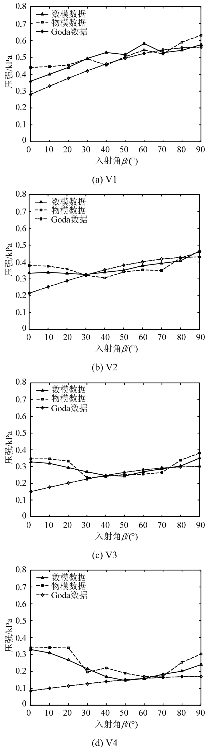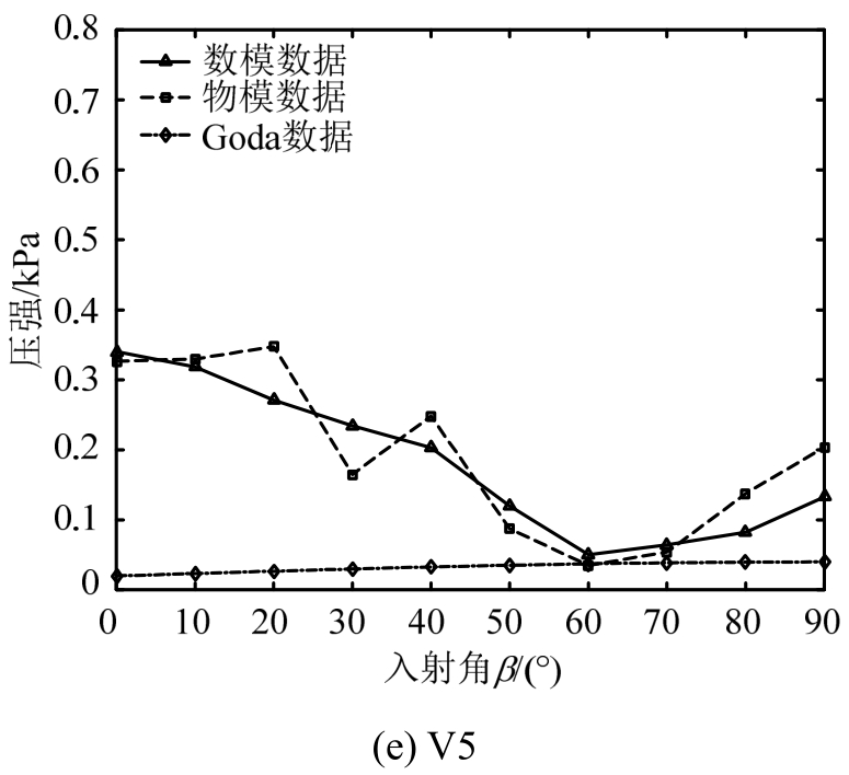 对于墙底波压力即浮托力的变化规律,由图12可知:①墙底各点浮托力随入射角度变化的趋势并不相同,V1及V2两测点整体上呈逐渐增大的趋势,在90°时浮托力最大,但其余三点呈先减小后增大的趋势,测点V3在0°和90°时的浮托力大小相近,V4、V5两点的最大值均出现在0°时,后三测点在50°或60°时浮托力最小;②合田公式在测点V1处的变化趋势与试验和数值符合较好,但总体上其对墙底浮托力随入射角变化趋势的描述不符合试验及数值结果,说明按合田公式设计墙底浮托力时不够安全。