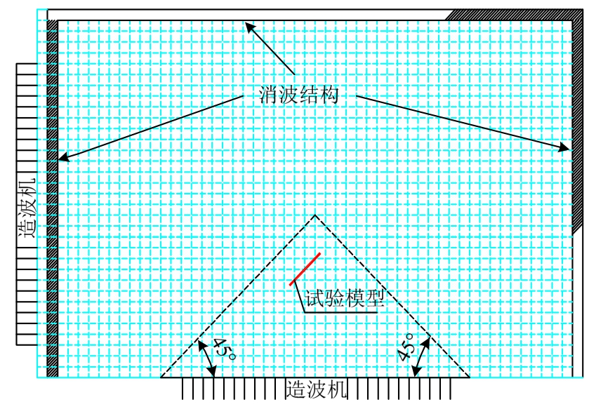 试验在海军工程设计研究院工程综合试验研究中心的长59 m、宽37 m、深1.2 m的室内水池中进行。水池装有“L”型造波机,能产生多向不规则波和规则波,造波范围涵盖180°。造波机推板单宽0.5 m,两侧造波总宽度分别为30m和26 m。采用DS-30系统测量波高和波压力,采样间隔为0.012 s,可以满足试验数据的采集及处理需求。