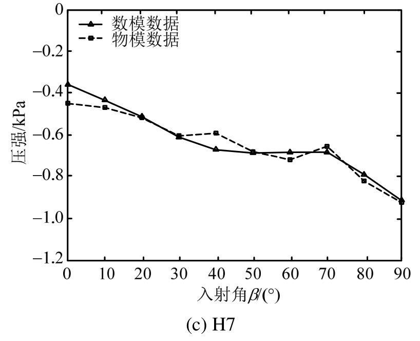 如图11和图12所示,数值计算各点波压力随波向的变化与试验结果吻合较好。由图11可知:①墙面各测点的波压力总体上随入射角度的增大而逐渐增大,0°时最小,90°时最大;②由合田公式计算的结果在总的变化趋势上与试验及数值结果相同,但其压力值普遍小于物模和数模的结果,说明合田公式在一定程度上低估了墙面波压力;③试验和数值结果不像合田公式随入射角单调增加,在某些角度压力值会发生突变,设计时要给予重视。