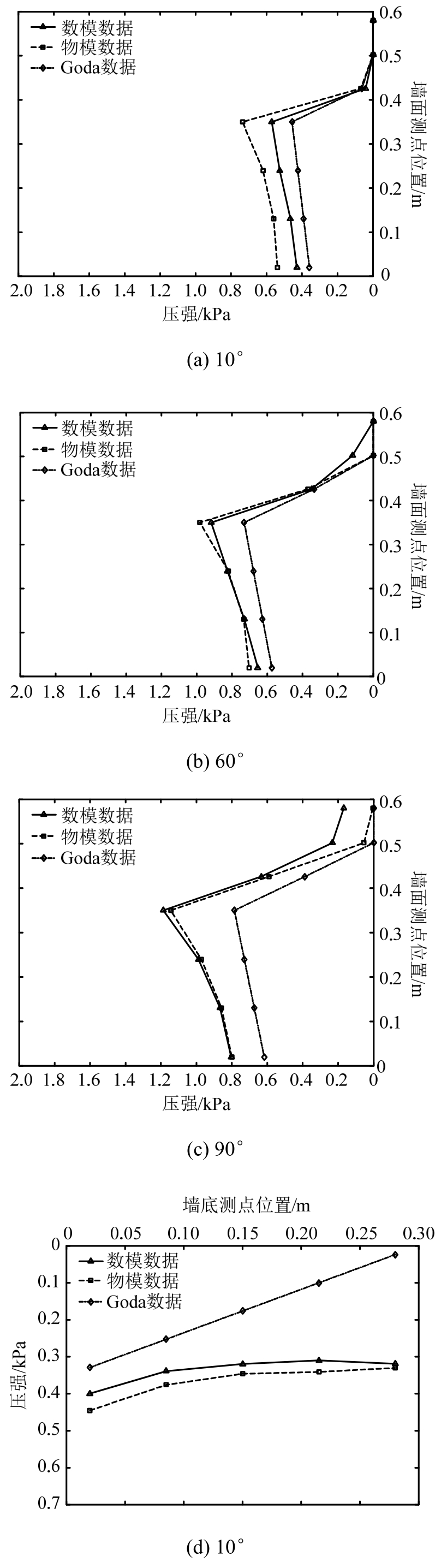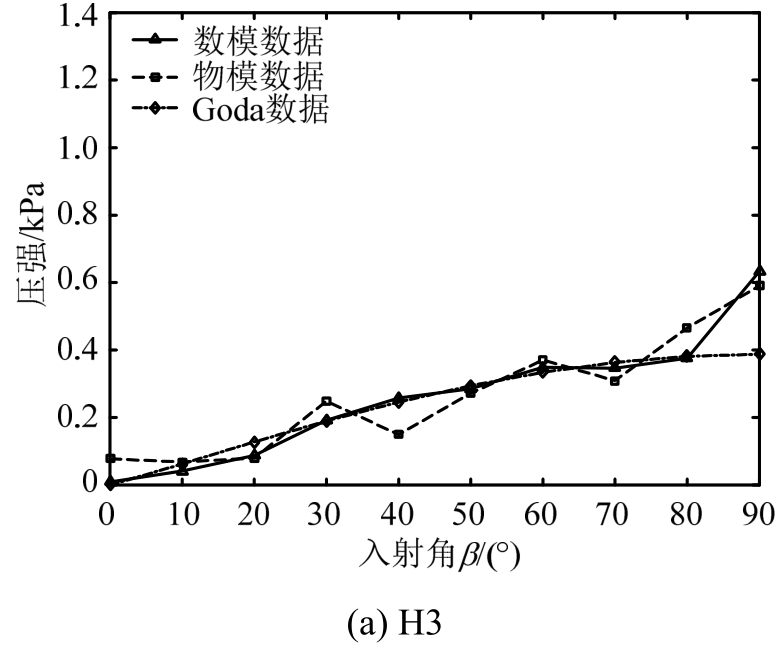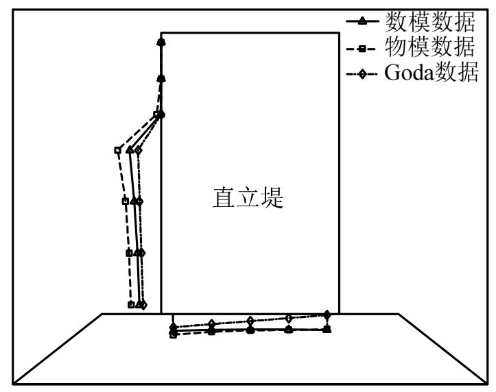 由于考虑了斜向波的作用,在设计直立堤时,常用合田公式计算波压力。本文将数模、物模及合田公式的结果放在同一图中进行比较分析。