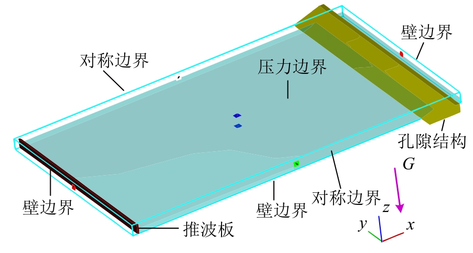 三维数值模型的边界条件如图6所示。使用推板造波及孔隙消波的方法,水池在x轴向上的两端(即前端和末端)设为壁边界;水池底面同样设为壁边界;在自由表面上压力需要满足动力学边界条件,ps=pa,pa为大气压,因此顶部设为压力边界;剩余两面设为对称边界,可避免波浪反射的影响。