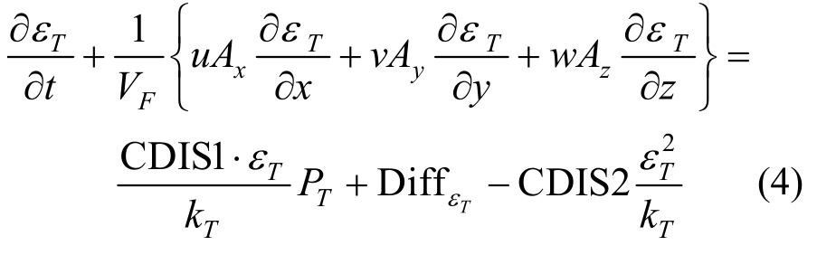 式中:PT为剪切效应引起的湍动能产生项;DiffkT和DiffεT为扩散项;CDIS1和CDIS2为模型参数。